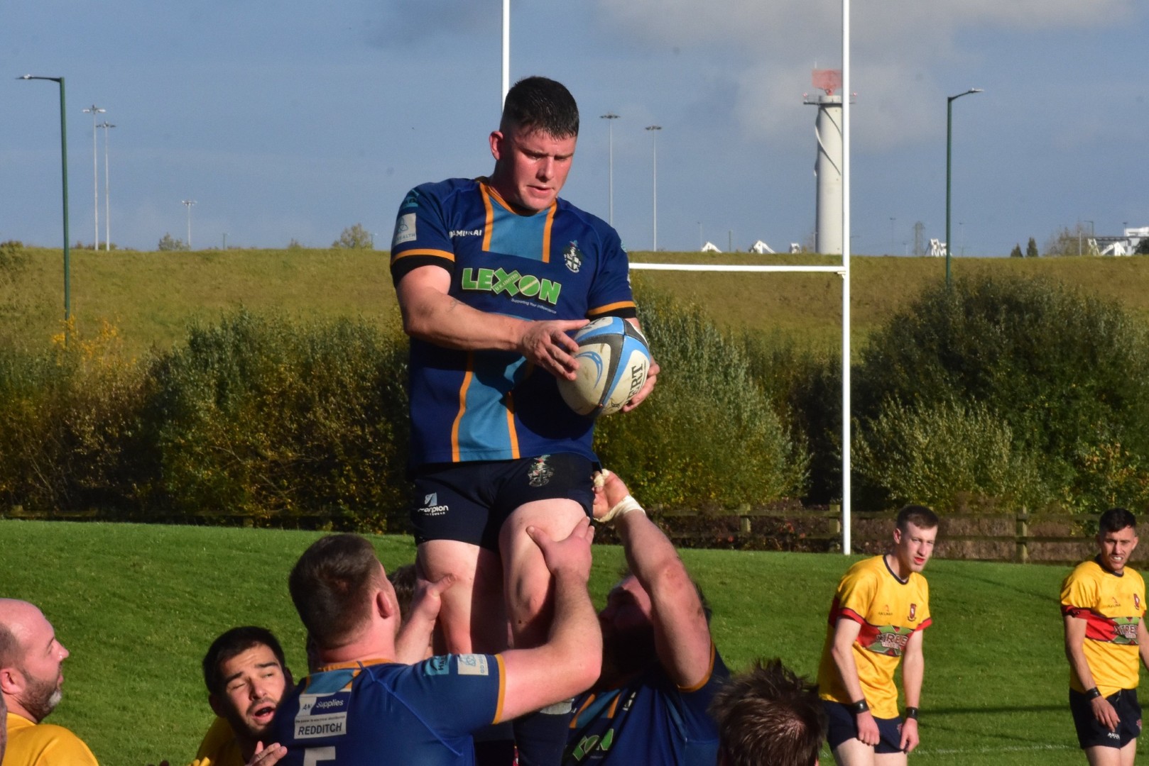 Clarke Parker is hoisted high by MIkey Adams and Matt Allen to take clean lineout ball