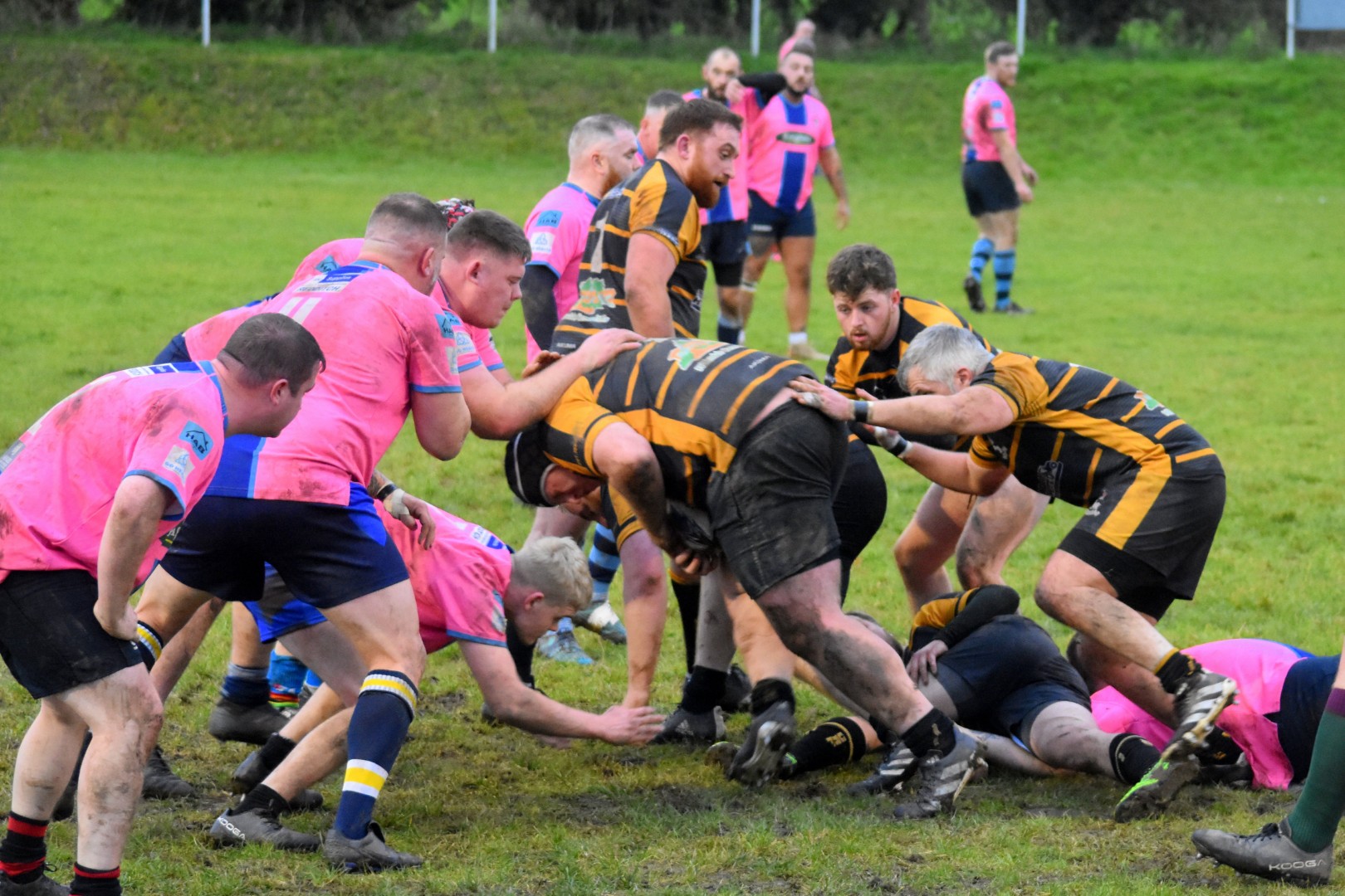 Playing in their changed strip of pink the R pack was dominant throughout, a driving maul from a penalty in the K 22 was the key to the opening try for Stu Brookes. it proved instrumental for the second try too when the visitors were pushed back 20m eventually giving the platform for James Mills to dive over a pile of bodies to score, Will Spires converting for a 12- 0 lead.