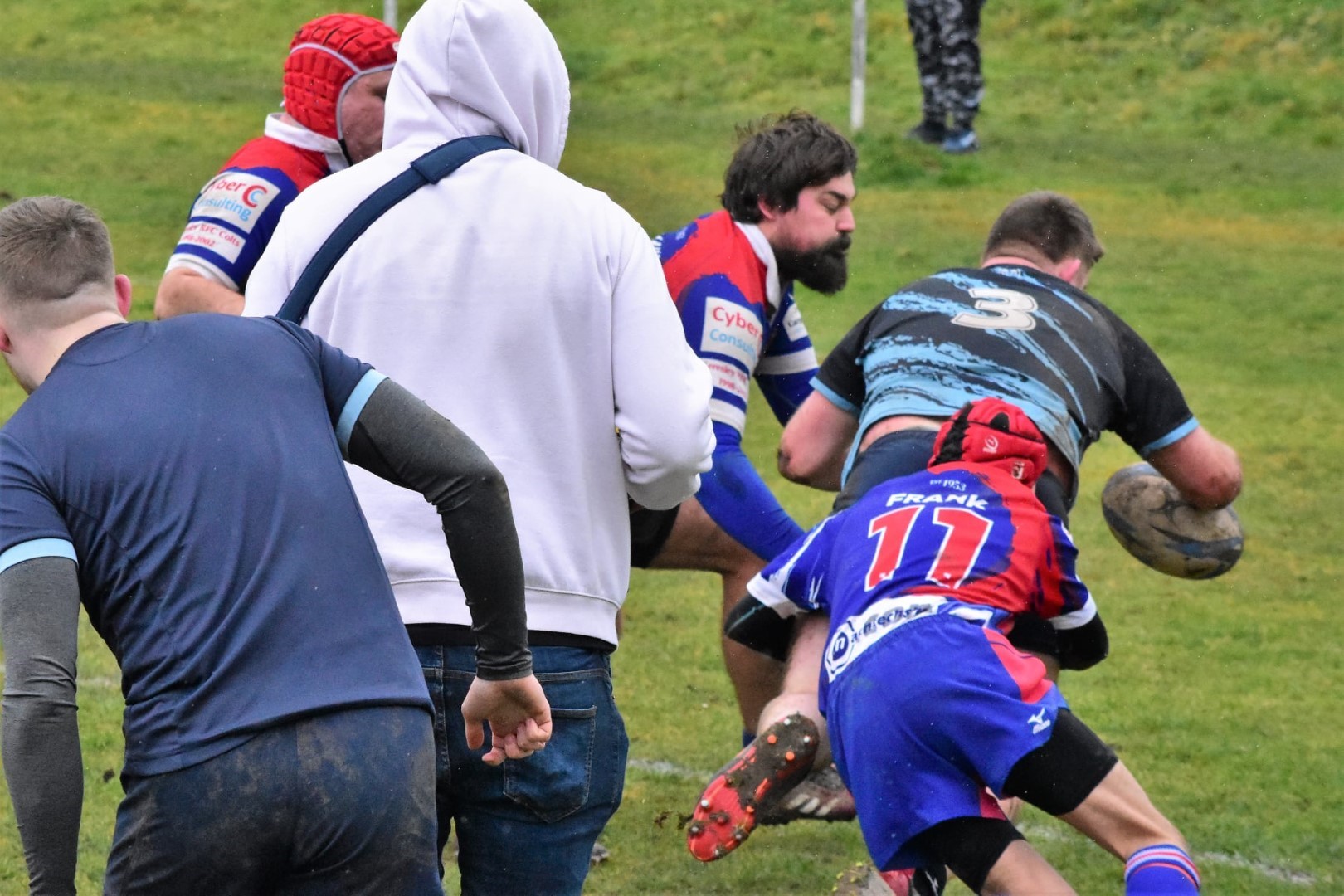 Second half had R with the wind in their faces and a K side revitalised by their score. R were caught flatfooted by a move from the base of a scrum for another converted try and a two point lead for K. More injuries resulted in more switches and positional manoeuvring which initially paid off. Territory was built upon and time spent in the opposition 22m resulted in Mikey Adams squeezing over the line out wide putting R back in the lead.